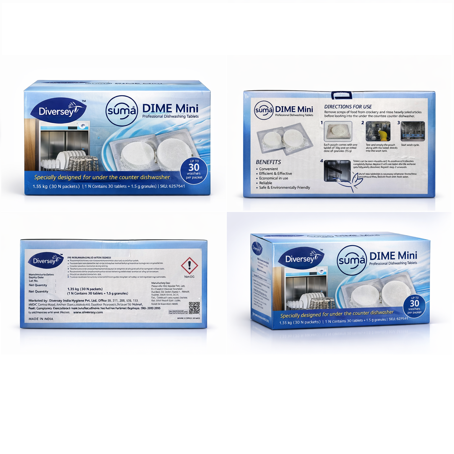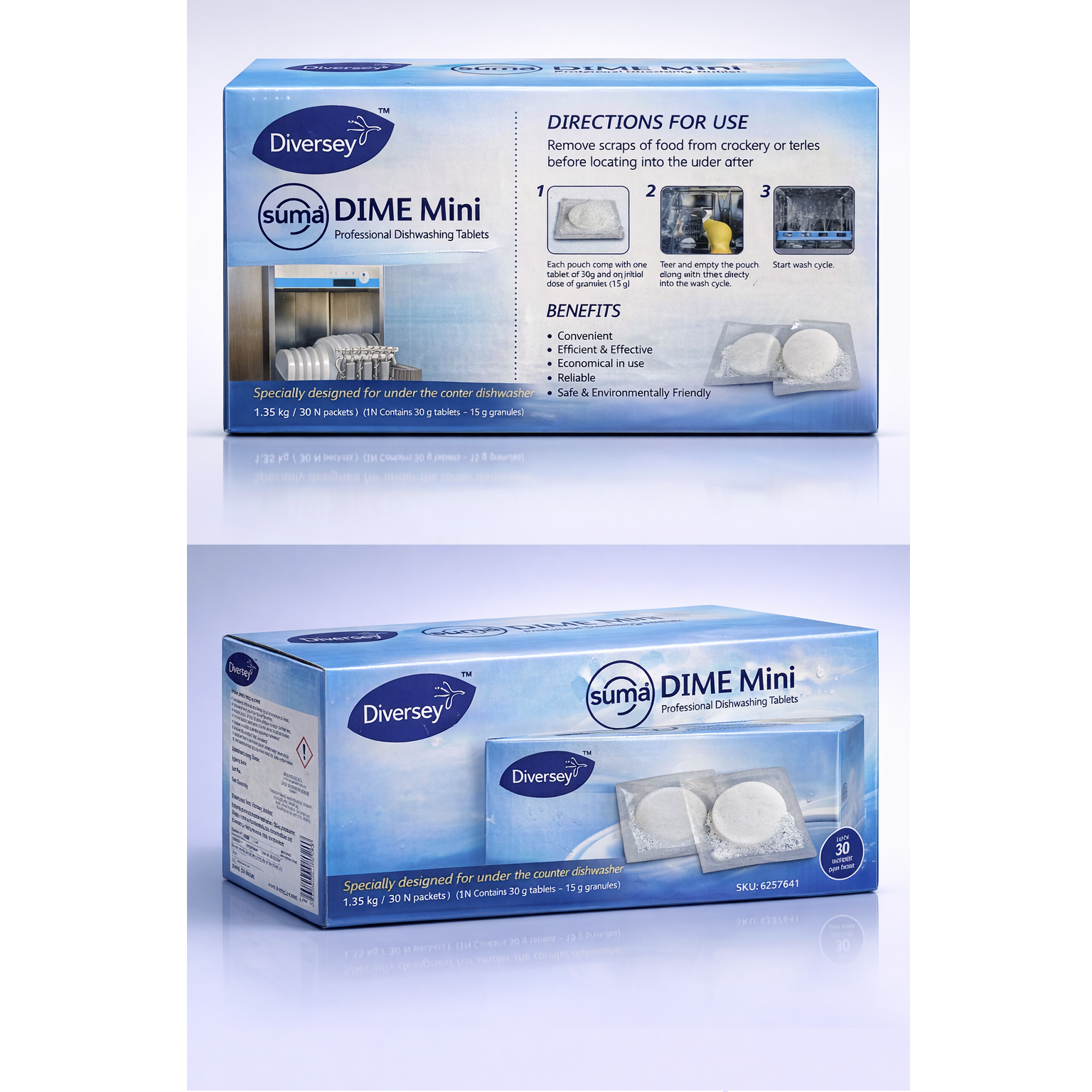 Suma DIME and Suma DIME Mini tablets are specially formulated with a patented technology of detergent with built-in rinse aid.They provide you with the convenience of a controlled dosing system without the need to install dosing equipment. They are formulated to remove difficult food residue and grease to ensure crockery, cutlery and glassware are left sparkling, clean and bright. Suma DIME is specially designed for all single tank hood type dishwashing machines. Whereas Suma DIME Mini is specially designed for all under the counter machines and glass washers, with and without strainer. Mechanical WarewashingReduce operational costs and achieve sparkling and hygienic results in your warewashing operation.Optimal cost-in-use. Super concentrated products. Right results first time. Management data to help decision making, increase hygiene and efficiency.Brochure: Suma Dime Mini Method Card.Brochure: SumaTM Dime Mini